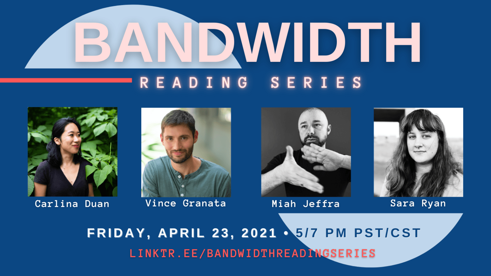 Hosted by Sebastián Hasani Páramo and K Iver, Bandwidth is a monthyl virtual reading series highlighting prose writers and poets around the country. This month, we feature Carlina Duan, Vince Granata, Miah Jeffra, Sara Ryan! Link to event here.
